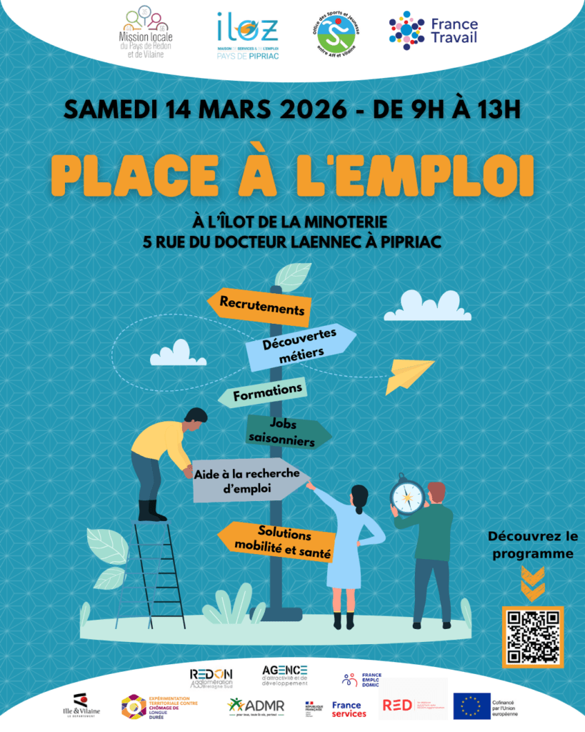 Rendez-vous samedi 14 mars de 9h à 13h à l’îlot de la minoterie à Pipriac pour le forum « Place à l’emploi » vous trouverez sur place :